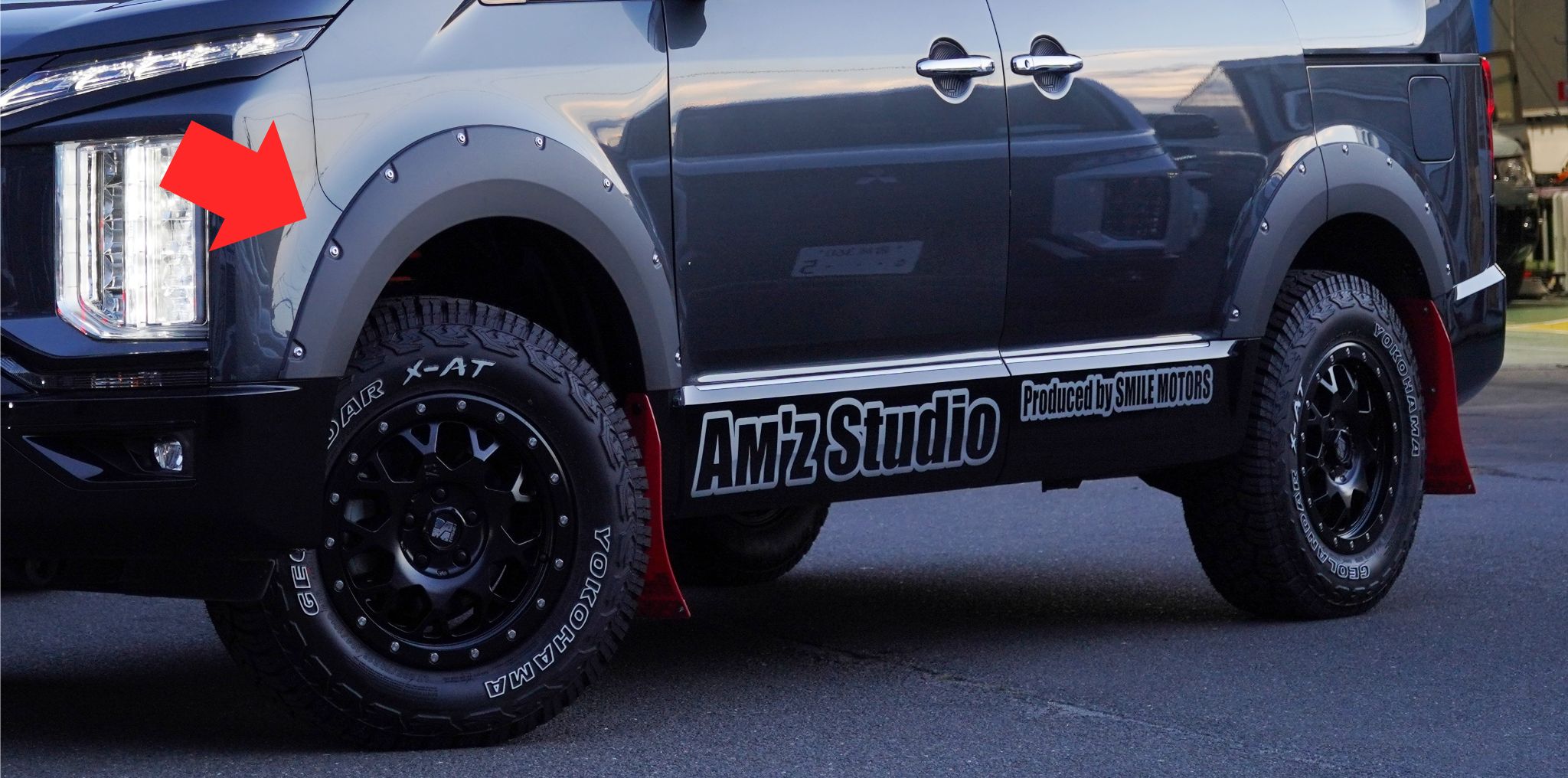 デリカD:5を納車してから、ドライブ中に街なかで他のデリカD:5を見る機会が増えたという新沼選手ですが、その中で「オーバーフェンダーが付いていない車両が多い」という印象を持ったそうです。実際、オーバーフェンダーを装着しているデリカD:5は少し珍しい存在です。(スマイルモータースだと、ド定番なのでレア度を忘れがちです…)